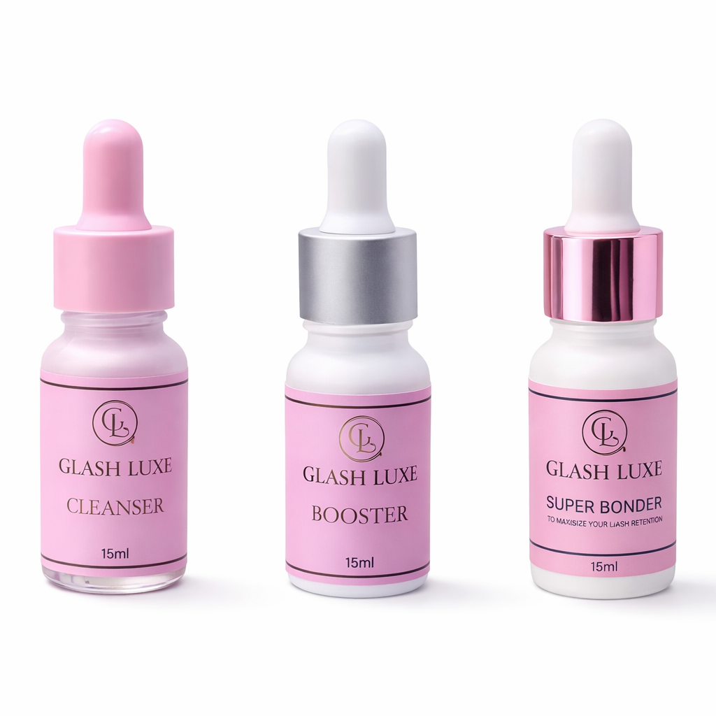 A complete professional lash preparation set designed for trained lash technicians to use before, during and after lash extension application. The Glash Luxe Trio includes three complementary liquids intended to support a consistent salon workflow and controlled adhesive application routine.